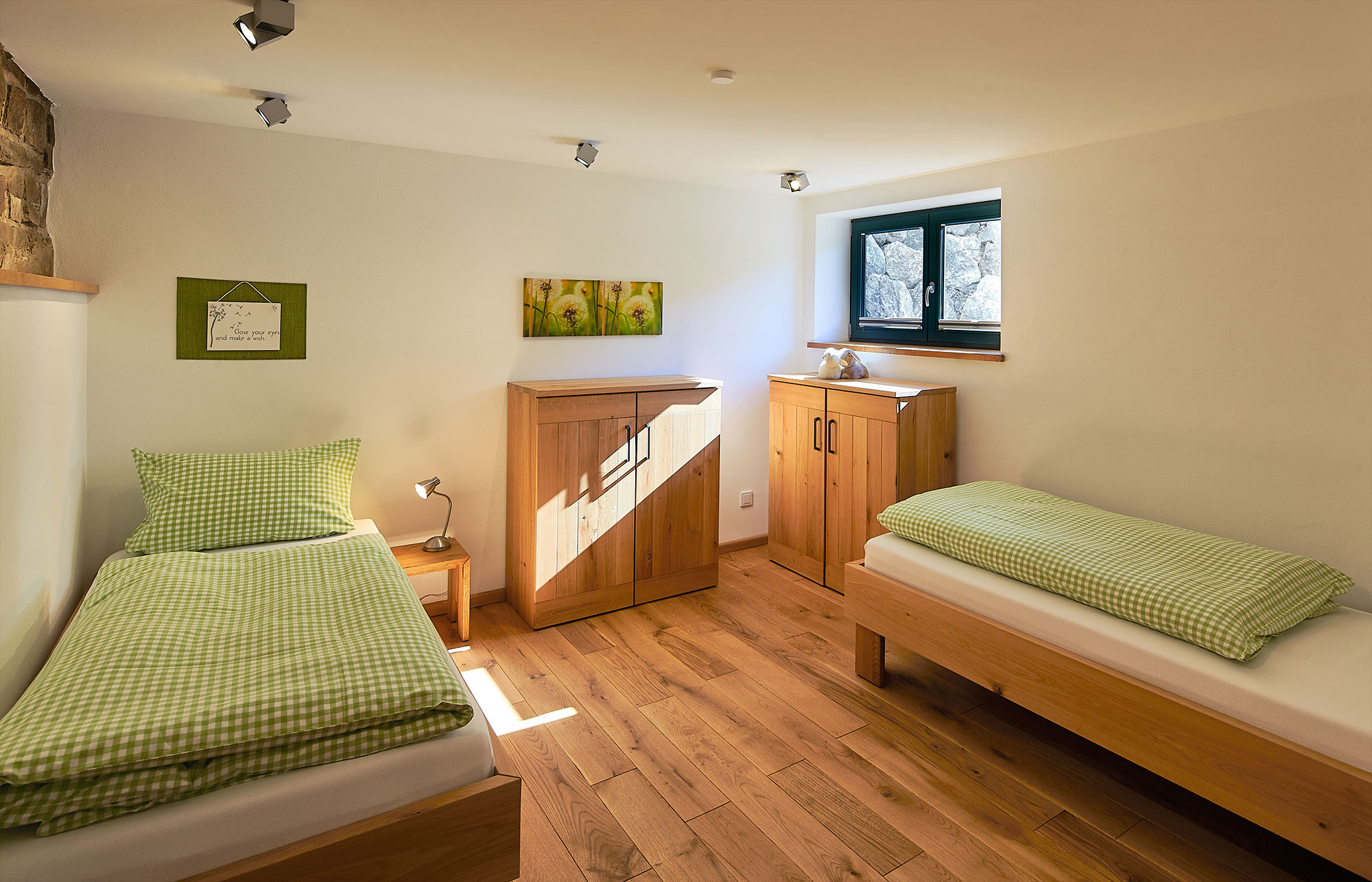 1 Doppelzimmer (1 x 2,00m x 2,20m), 1 Zweibettzimmer (2 x 0,90m x 2,00m), Bad und Flur
