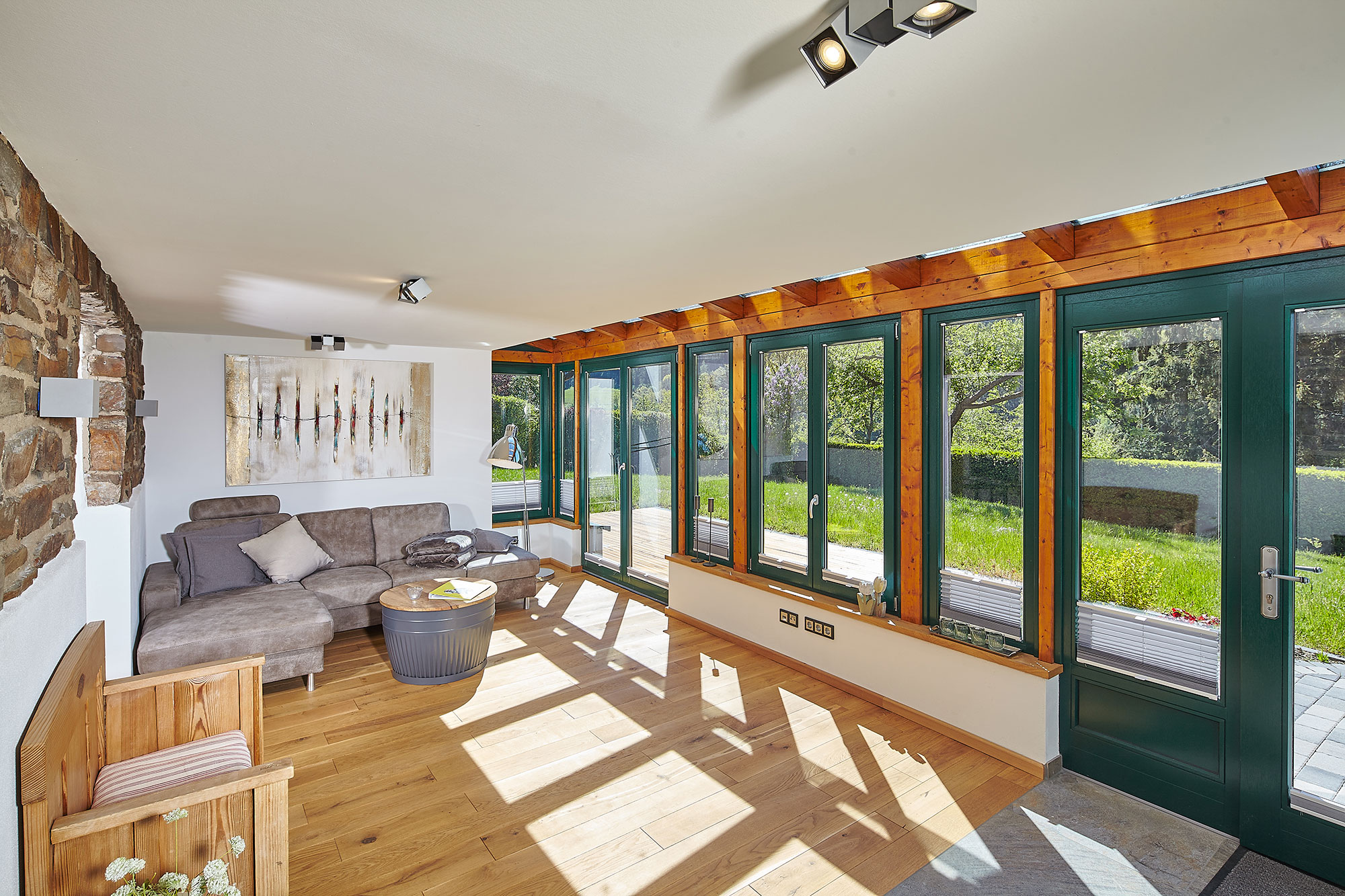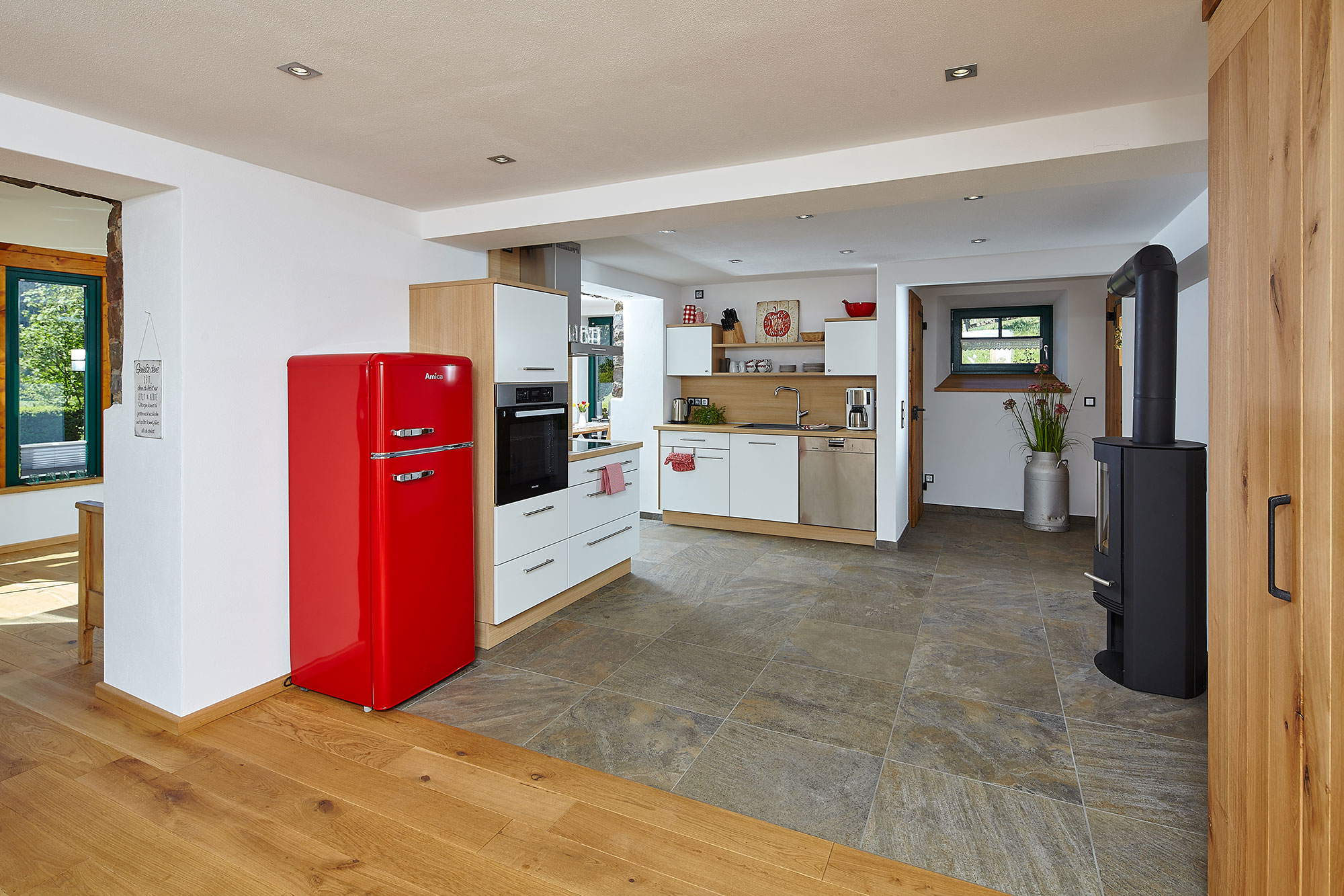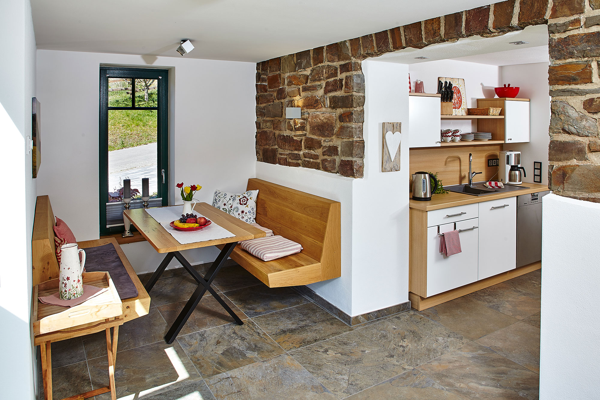 Wohnbereich mit offener Küche, Couchgarnitur, Essplatz am Fenster